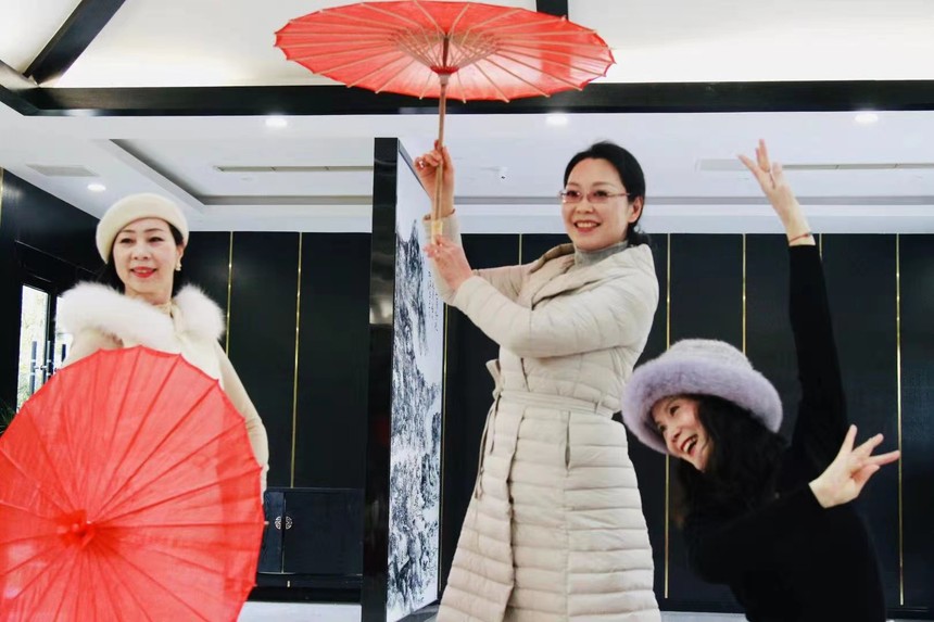 天气虽然严寒,但学员们热情高涨。课中纷纷展示了油纸伞舞、太极、时装走秀等才艺。比室内上课更有激情,更活跃。